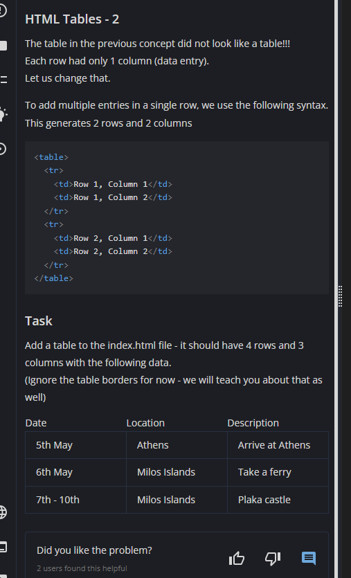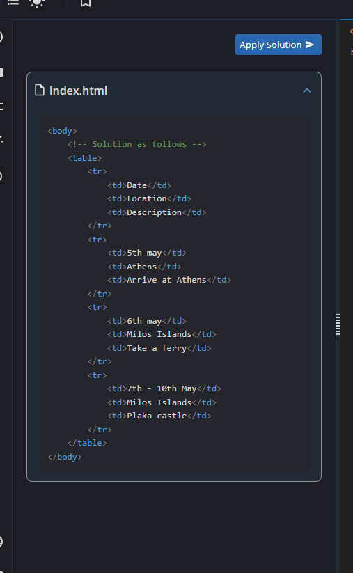 We are expected to create a table and the last row says we need to have ‘7th - 10th May’ But in the table shown it only says ‘7th - 10th’, thus failing the tests.