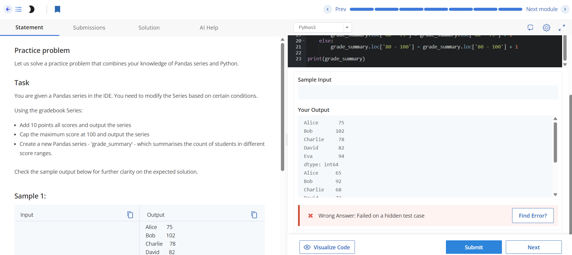 I am unable to proceed through this problem due to failed test cases even if i am using the code mentioned in the solution.