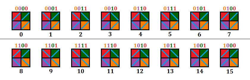 Letâs look again at the 16 configurations for the 2\times 2 grid. Note that each configuration differs from its previous configuration by exactly 1 tile. If we mask the tiles by assigning left-top tile as bit 0, right-top tile as bit 1, left-bottom tile as bit 2 and right-bottom tile as bit 3, then the bitmasks of each configuration will be the one given above it. The sequence we get is the Reflected Binary Code also known as Gray Code. You can read more about it here.