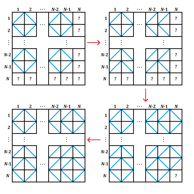 Finally, let us extend our idea to N\times N grids where N is odd. First, we will set up an (N-1)\times (N-1) grid as above. Then, we will invert all the tiles in the second-last row and second-last column except the last ones. Then we will set up the blocks in the last two rows and columns except the bottom-rightmost one. Finally, we will set up the bottom-rightmost block by inverting the tiles in the cells (N-1,N-1), (N-1,N) and (N,N-1) and trying the two configurations for the last cell. The whole process is described in the image below -