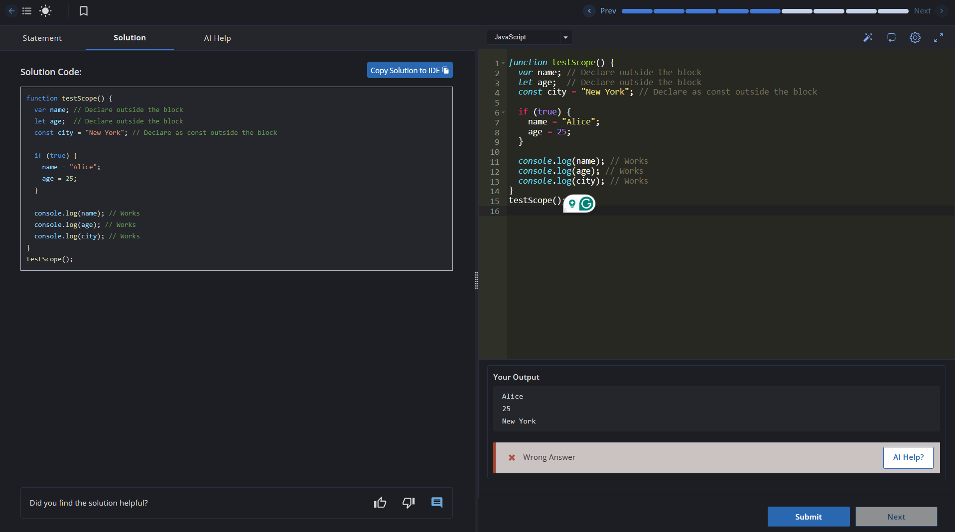 No matter, what code i have in IDE the answer always fails even if i copy the code from solution tab. I Have tried all the possible options, the test allways fails, When the Code from solution tab failed i Even ran the question with “AI Help” tab as well as OpenAI both say my code was correct and could not find any issue.