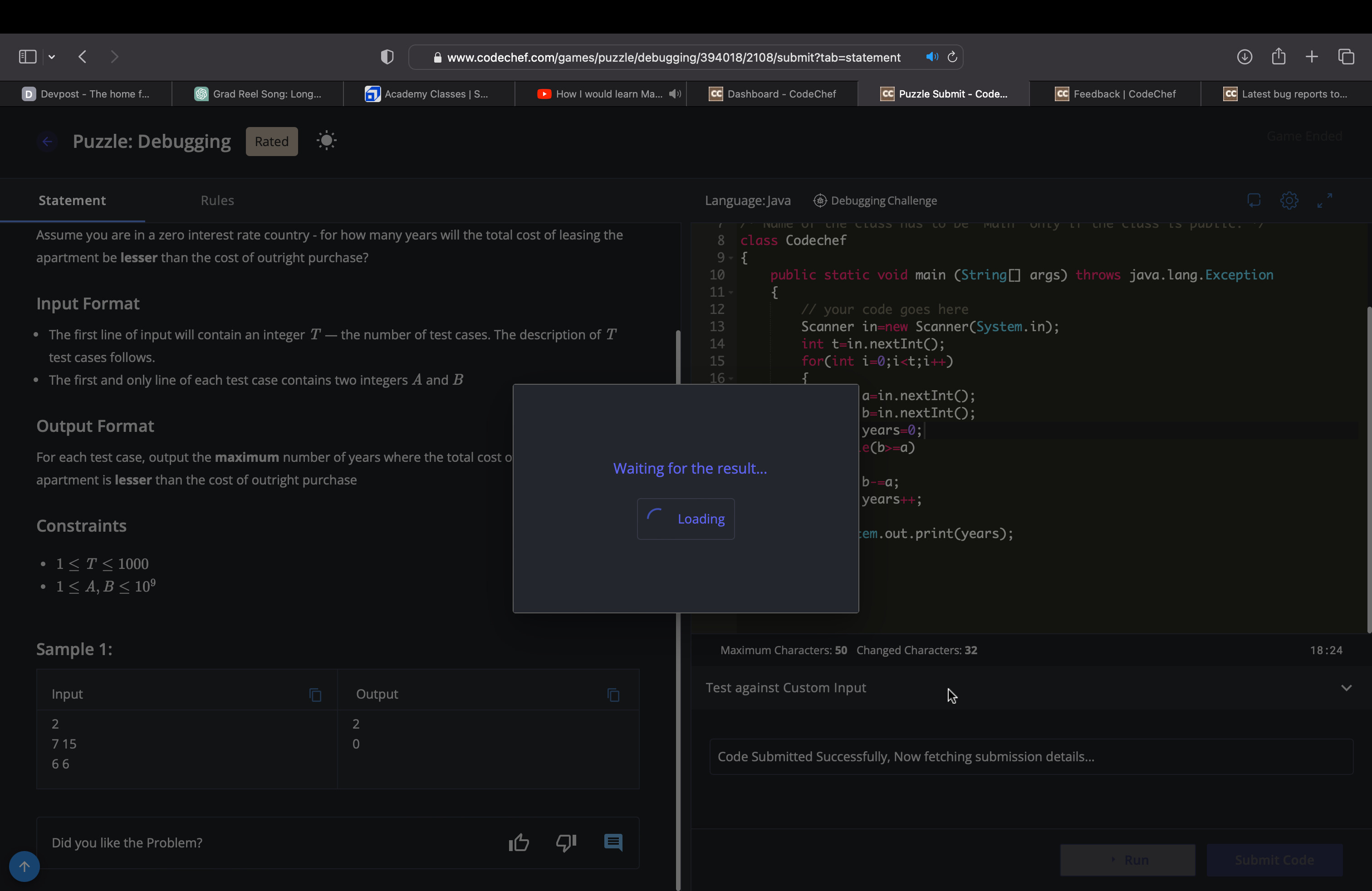 I played the debugging game and submitted a solution under a minute. But it continuously showed “Fetching results” and the code never got submitted. Timeout of the game happened still it was stuck on “Fetching submission results for about 30 mins”. After that I could see my rating dropped for game on my profile which is techically wrong.