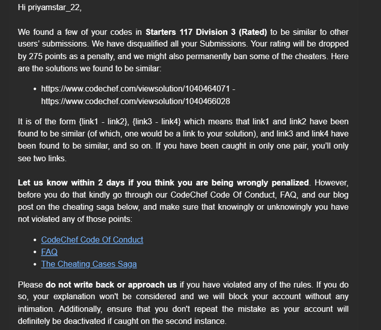 It has been distressing to witness a significant decrease of 275 points in my rating, especially knowing that I am innocent of the allegations presented against me. I have been an active and dedicated member of the CodeChef community, and it is disheartening to see my efforts tarnished by an unjustified penalty.