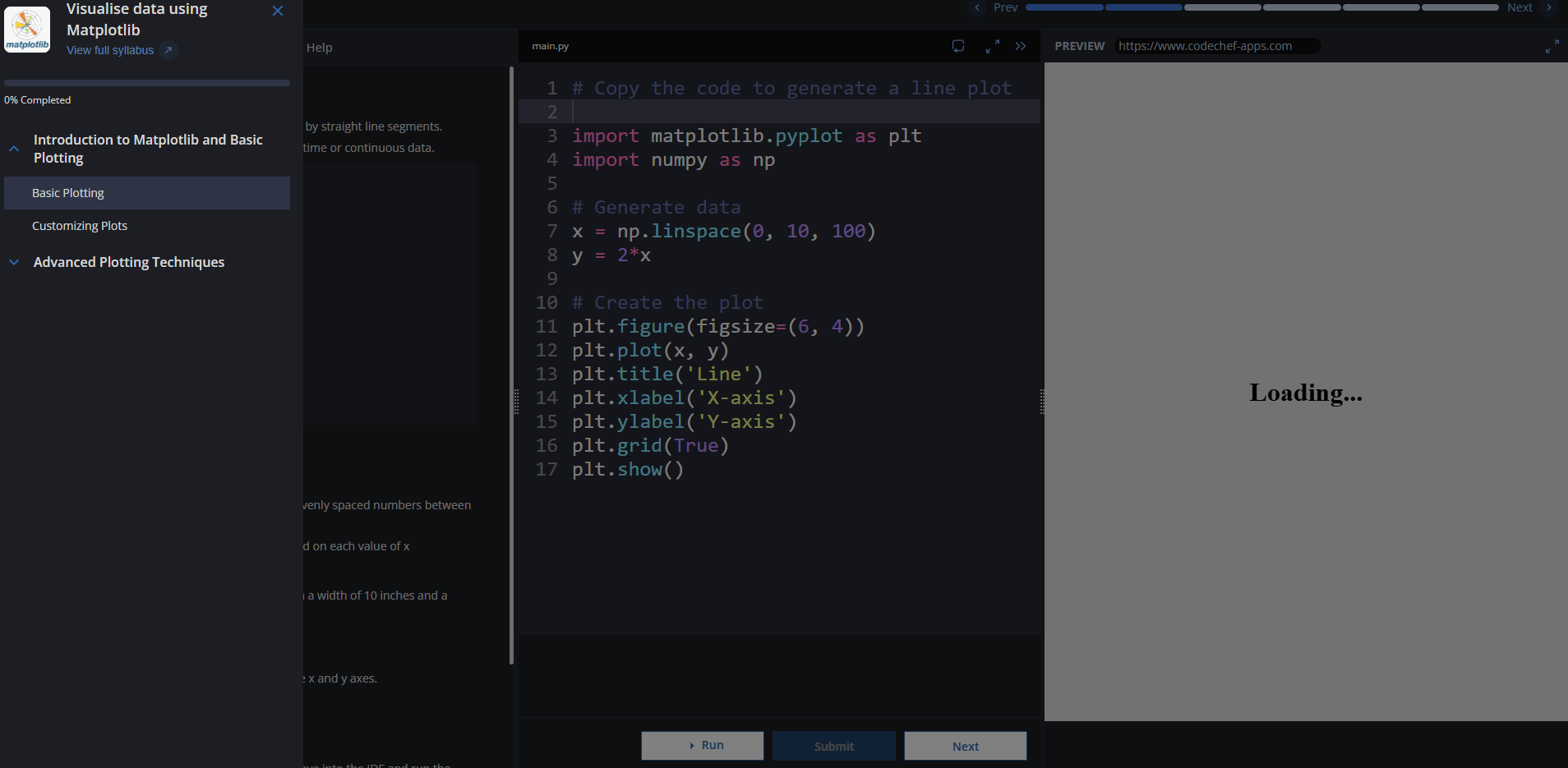 I am doing this course Visualise data using Matplotlib in that i can’t see output in preview it just saying Loading and this doesn’t happen with 1st page I have this issue after 2nd page till last.