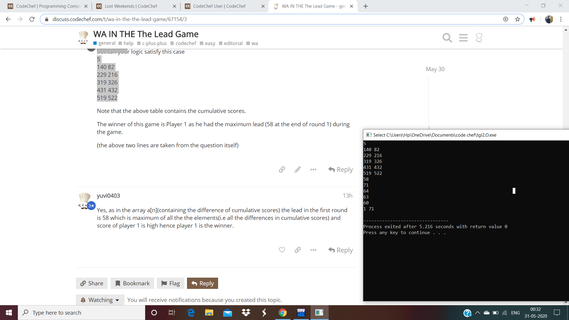 In the arrays s[n] and t[n] you are storing the score of player 1 and 2 in each game separately and storing the lead in that particular game itself but according to question what you need to do is that you have to calculate the cumulative score which means score of this game added with the scores of all the previous games and then calculate lead and when this lead is maximum of all you have to declare the winner.