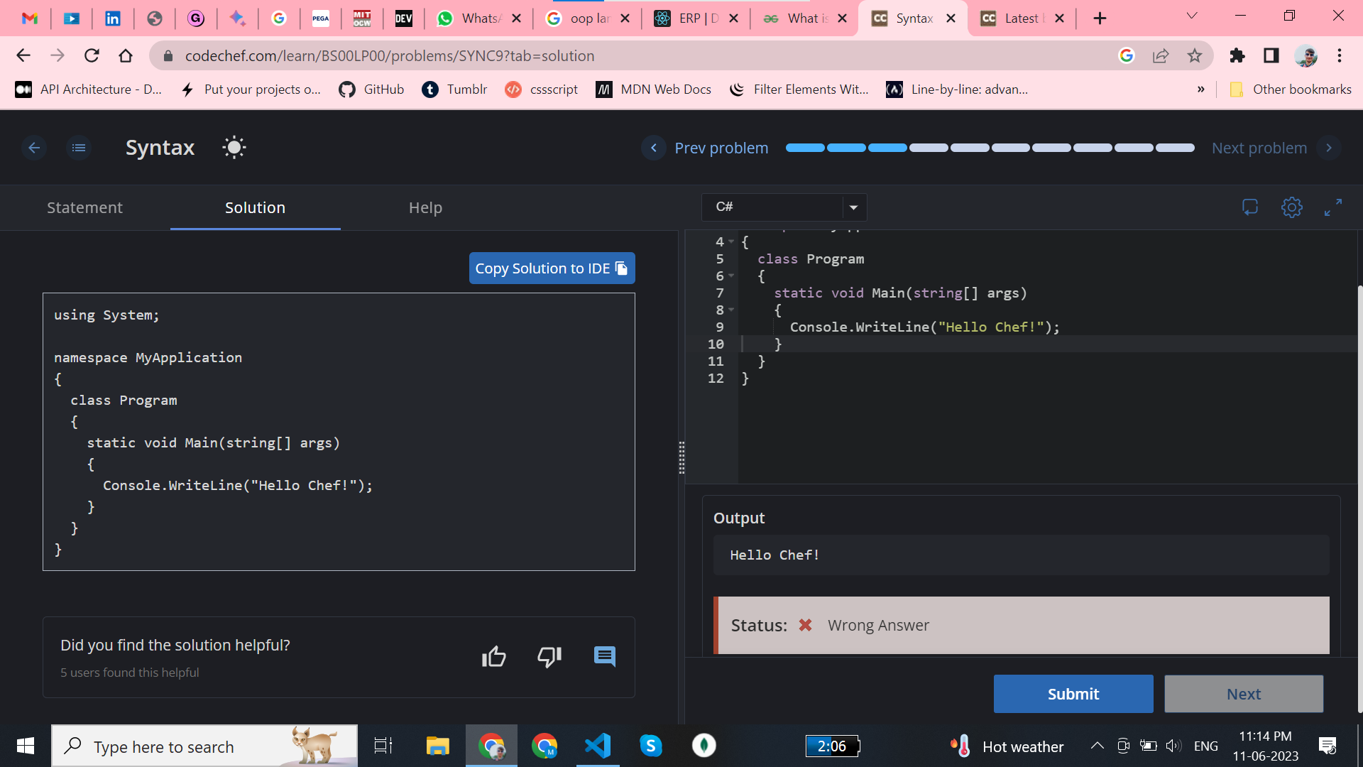 I have practicing the priting Hello Chef!, eventually the status in wrong while submitting the question. and then when i review the answer and paste it to the IDE it again having the same status.
