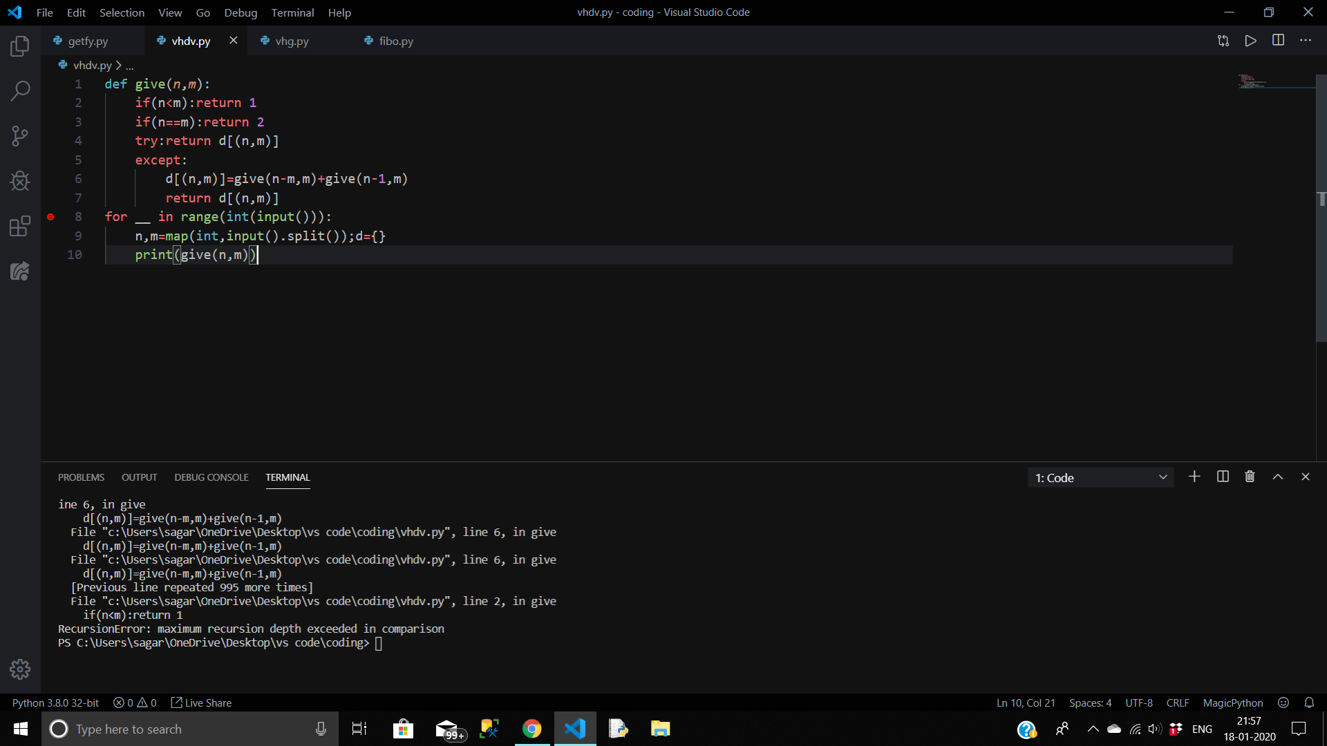 dp - tilling problem (n*m) my code is giving correct answer for small N and M - upto --less than 1000. after that it is giving key error. here i apply recursion and use dictionary for memoization.