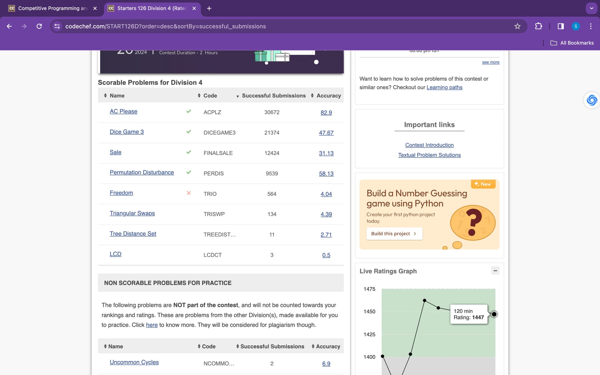 After the starters 126 contest my rating went up to 1447 in the live graph and it stayed as 1447 for a few days in my profile too, till last tuesday when i checked my rating had went down to 1312 and the highest rating was 1385, while my highest was 1447. I even wrote starters 125 contest in division 3 when my rating was in 1400s.
