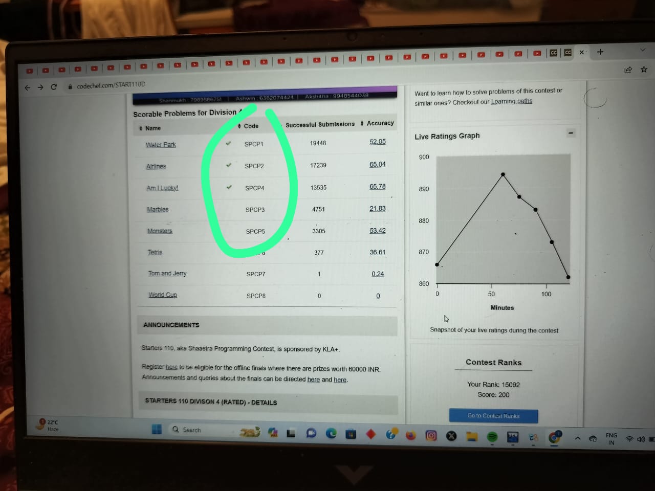 I have correctly submitted the codes of 3 questions but the score has been calculated of only 2. My score should have been 300 but its showing 200. Please rectify this error because due to this my ranking has been affected severely.