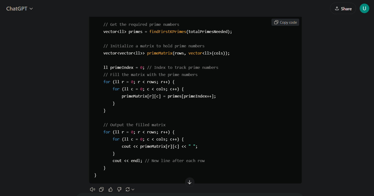 Now, consider the remaining code of the solution, after generating the required number of prime numbers (rows × columns) using the Sieve of Eratosthenes, I simply stored them in a vector and then filled a 2D matrix with those primes, printing the matrix row by row. This approach is a basic implementation, and there isn’t much room for variation. To expedite the process, I used GPT to assist in generating some boilerplate logic, as the matrix-filling part is relatively standard. A screenshot of this interaction is also attached for your review.