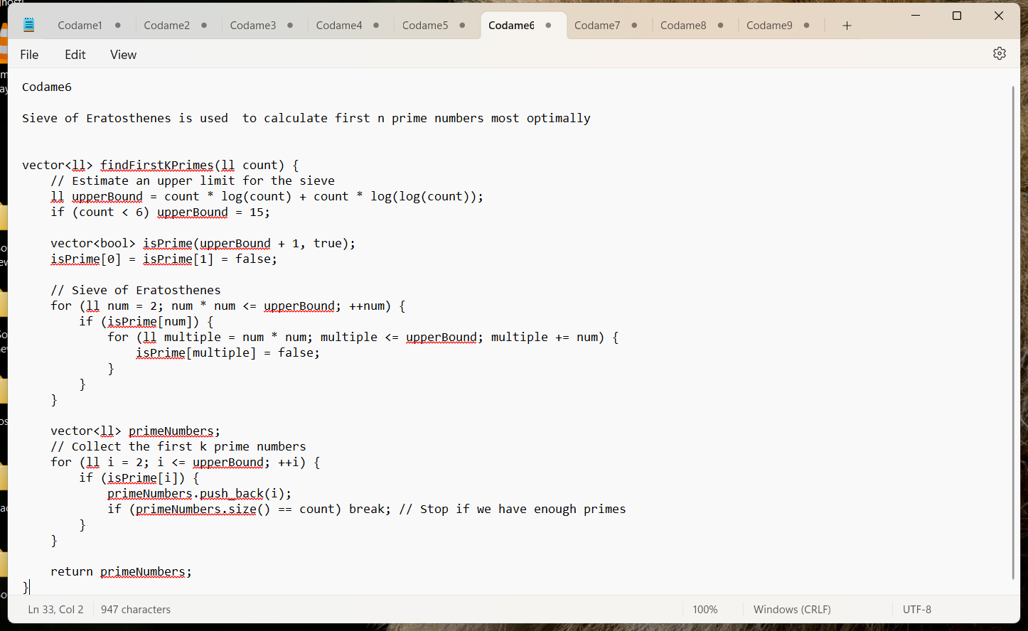 To provide further context, I maintain a personal notepad where I store commonly-used algorithms that I find beneficial during contests, including the Sieve of Eratosthenes. This helps me save time by quickly referencing these standard methods instead of rewriting them from scratch. The attached screenshot of my notepad confirms that this practice is not specific to this contest and that the Sieve algorithm was readily available to me beforehand.