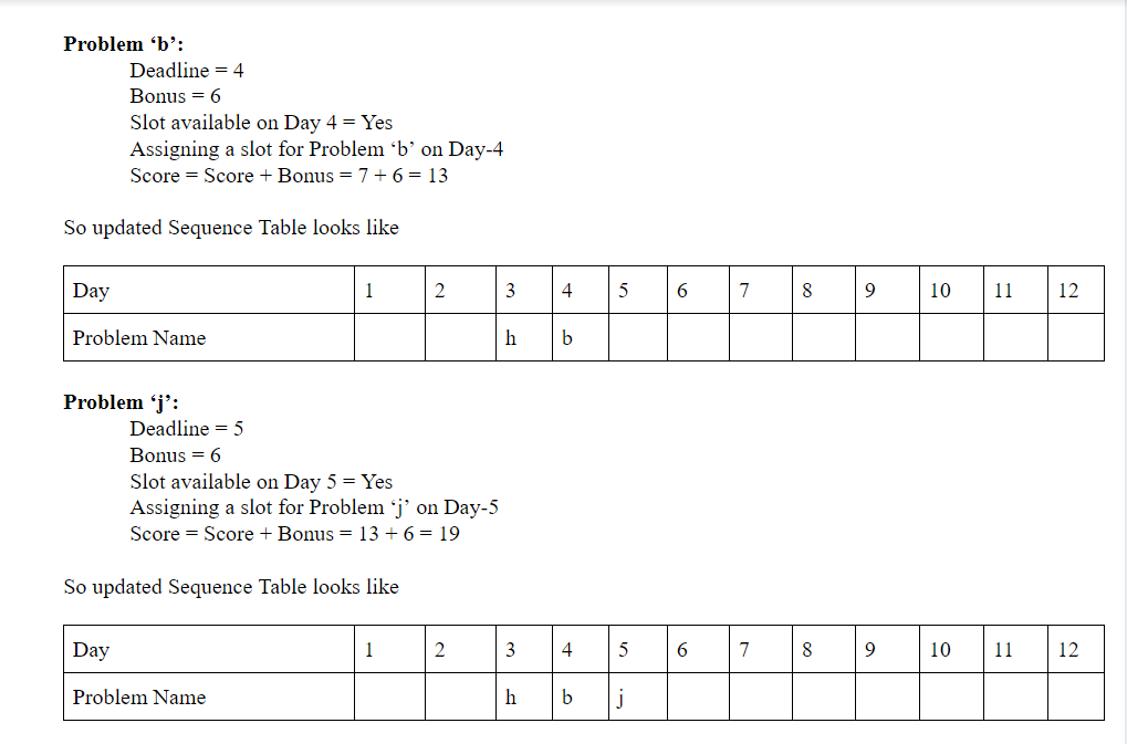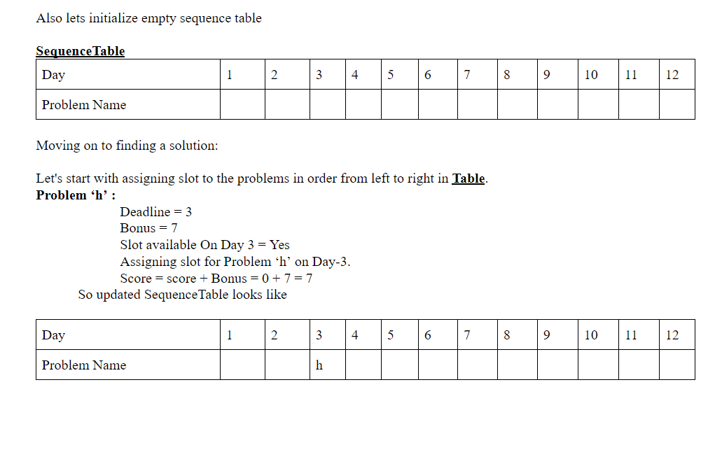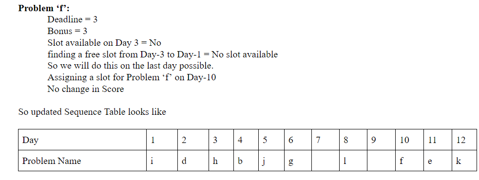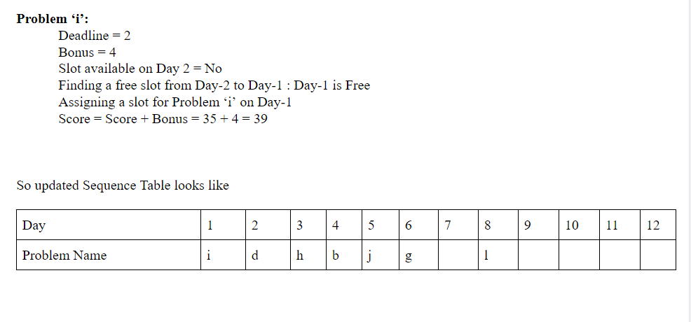 Also we will also have a variable named “score” initialized to zero. This variable will be describing the total bonus marks earned. Whenever we assign a slot for a problem in it’s deadline we will add its bonus marks in this variable.