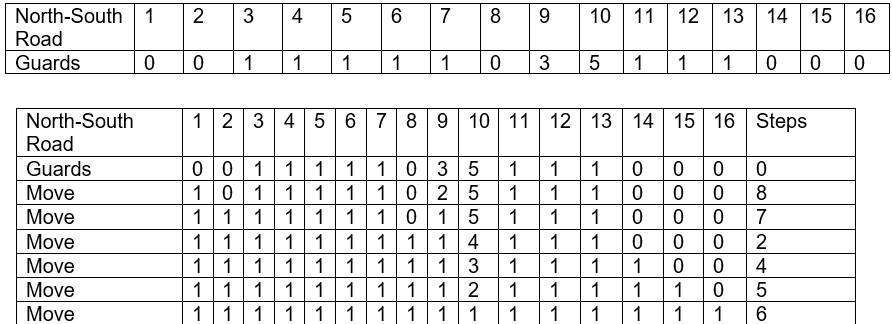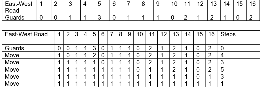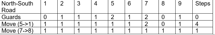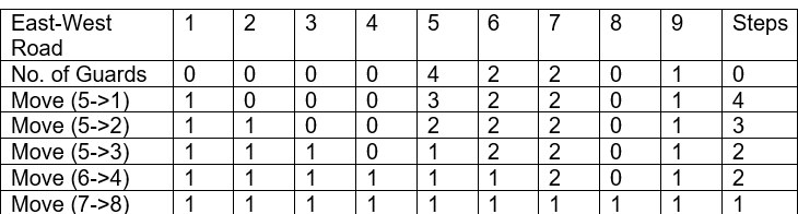 In the table below the initial position of guards are given in 1st row (0 guard on 1st, 2nd, 3rd, 4th Road, 4 guards on 5th Road, 2 guards on 6th and 7th, 0 guard on 8th and 1 guard on 9th East-west Road). After the 1st move 1 guard from 5th column shifted to 1st column and So on.
