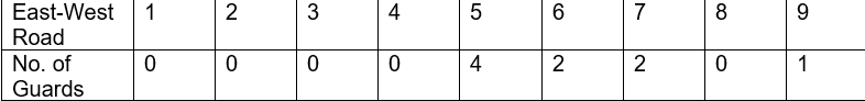 Suppose on north-south road there are 3 guards on the 1st column, 1 in 2nd, 0 in 3rd, 2 in 4th,1 in 5th and 0 in 6th and 7th.